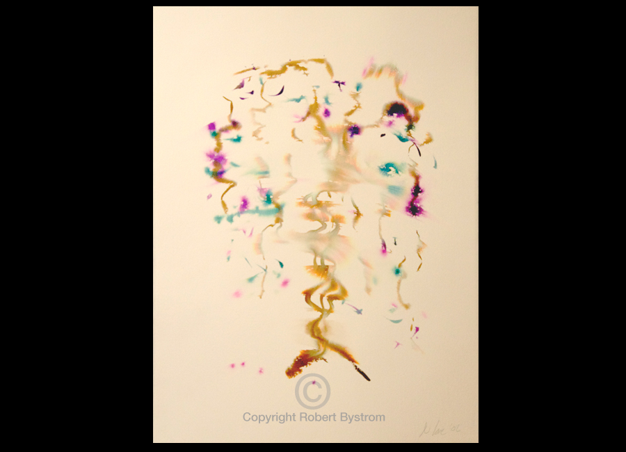 Beginning with lost-wax bronze casting and carving in stone and wood in India, he gained recognition with his innovative acrylic kinetic sculptures, with shows in Philadelphia by the late ‘60’s. His initial work on paper was sumi-e brush and ink, which led to experimenting with flashy colored inks and water, one piece of which landed on the cover of The Encyclopedia of Living Artists in America, 1987, while he was living in the San Francisco Bay Area.