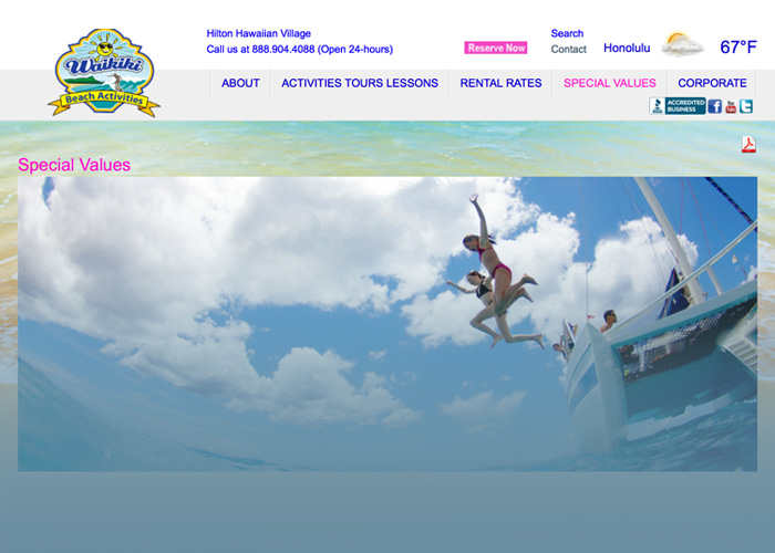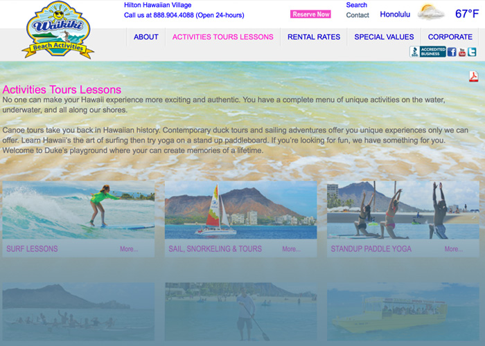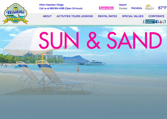 Utilizing WordPress CMS, this beach activity and rental company employs fun imagery and friendly navigation to entice visitors to explore this site in detail.