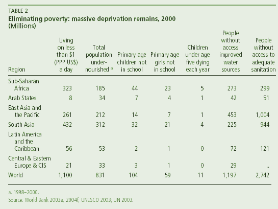 »Actions To Take |  | SOCIAL & ECONOMIC INJUSTICE Socially and economically we have created great disparities of wealth with a minority of the world's population (17%) consuming most of the world's resources (80%), leaving almost 5 billion people to live on the remaining 20%. As a result, billions of people are living without the very basic necessities of life of food, water, housing, sanitation, health etc. Specifically, 1.2 billion (that is 20%) of the world population now lives on less that $1/day, another 1.8 billion (30%) lives on less than $2/day, 800 million go to bed hungry every day, and 30,000 - 60,000 die each day from hunger alone. The story is the same, when it comes to other necessities like water, housing, education etc. On the flip side we have increasing accumulation of wealth and power, where the world's 500 or so billionaires have assets of 1.9 trillion dollars, a sum greater than the income of the poorest 170 countries in the world. The following table from UNDP (United Nations Development Programme) shows the millions of people living without the basic necessities of food, education, water, sanitation.  Some More Facts: Rich Man Poor Man - The amount of money that the richest 1 percent of the world's people make each year equals what the poorest 57 percent make.